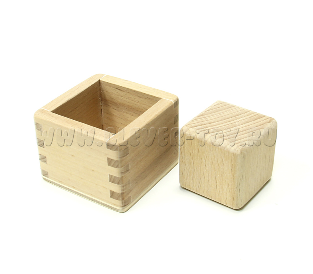 Одна из первых игрушек младенца, умеющего сидеть. Развивает моторику, координацию "глаз-рука", скоординированную работу обеими руками, мышление. Ребенку необходимо перевернуть коробочку, чтобы вынуть кубик, и сориентировать правильно углы, чтобы поместить кубик в коробочку.