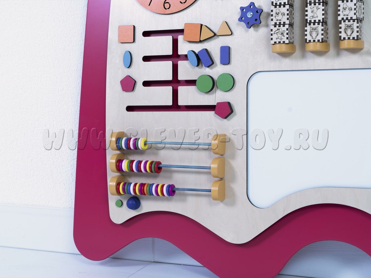 Бизиборд "Вит" предназначен для детских образовательных учреждений и помогает изучать геометрические фигуры (форму, количество углов, вид, цвет и особенности). Задания составлены по принципу "от простого к сложному". Например, при изучении геометрических фигур можно тренироваться в счёте, определяя количество углов. Также можно рисовать запомнившиеся фигуры или играть в крестики-нолики, вращая фигуры.