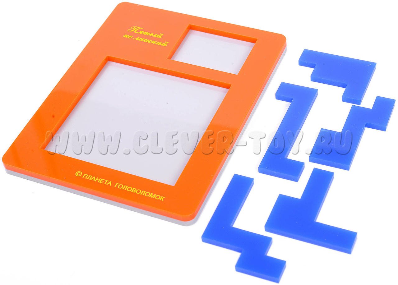 Нужно разместить все элементы в коробочке. Как обычно в таких задачах, элементы можно как угодно поворачивать и переворачивать, но нельзя накладывать друг на друга. При этом общая площадь всех элементов составляет около 80% площади квадратной ниши, так что свободного места для размещения всех пяти элементов достаточно. Однако, задача не так проста. Известно единственное решение этой головоломки.