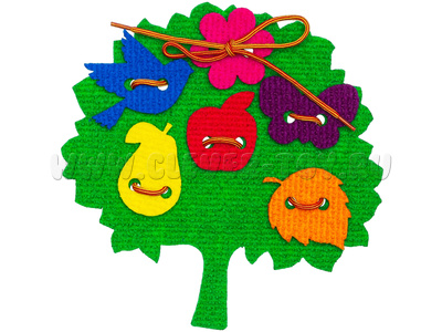 Например, «Украшаем деревце» - игра для самых маленьких. Вместе с ребёнком наложите одну фигуру на другую и соедините с помощью шнурка. Игра «Кто быстрее?» - предложите малышу посоревноваться в том, кто быстрее с помощью шнурка прикрепит все игровые элементы.