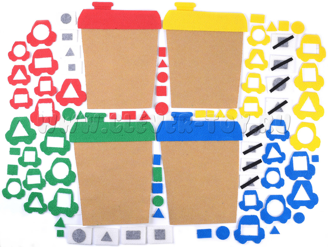 - гаражи для машинок 4 штуки: жёлтый, зелёный, синий, красный;
