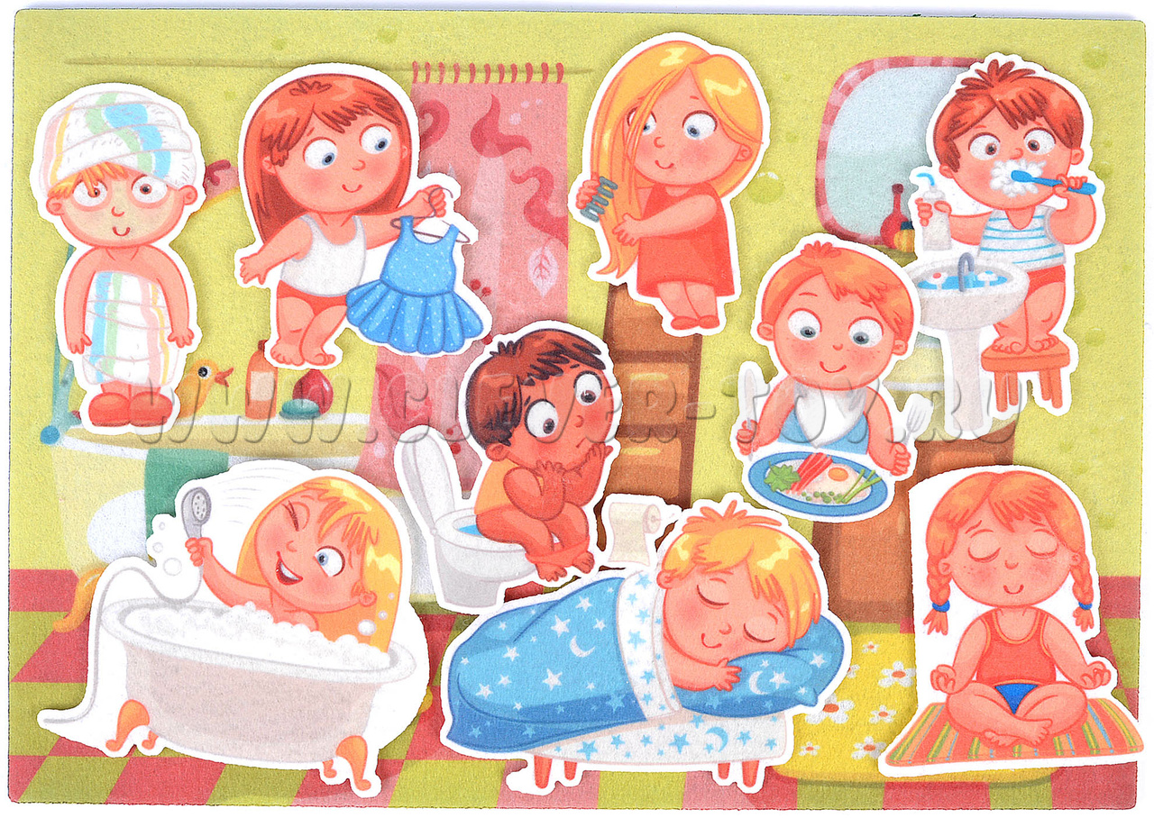 - 9 фигурок: ребёнок, сидящий на горшке, ребёнок, который чистит зубы, кушает, занимается йогой, расчёсывается, спит, одевается, ребёнка, принимающего ванную, ребёнка, закутанного в полотенце после купания;