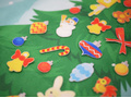 • игровые элементы из фетра – ёлочные игрушки (звёздочки, шишечки, зайчики, шарики, колокольчики, часики, бантики, леденцы).
