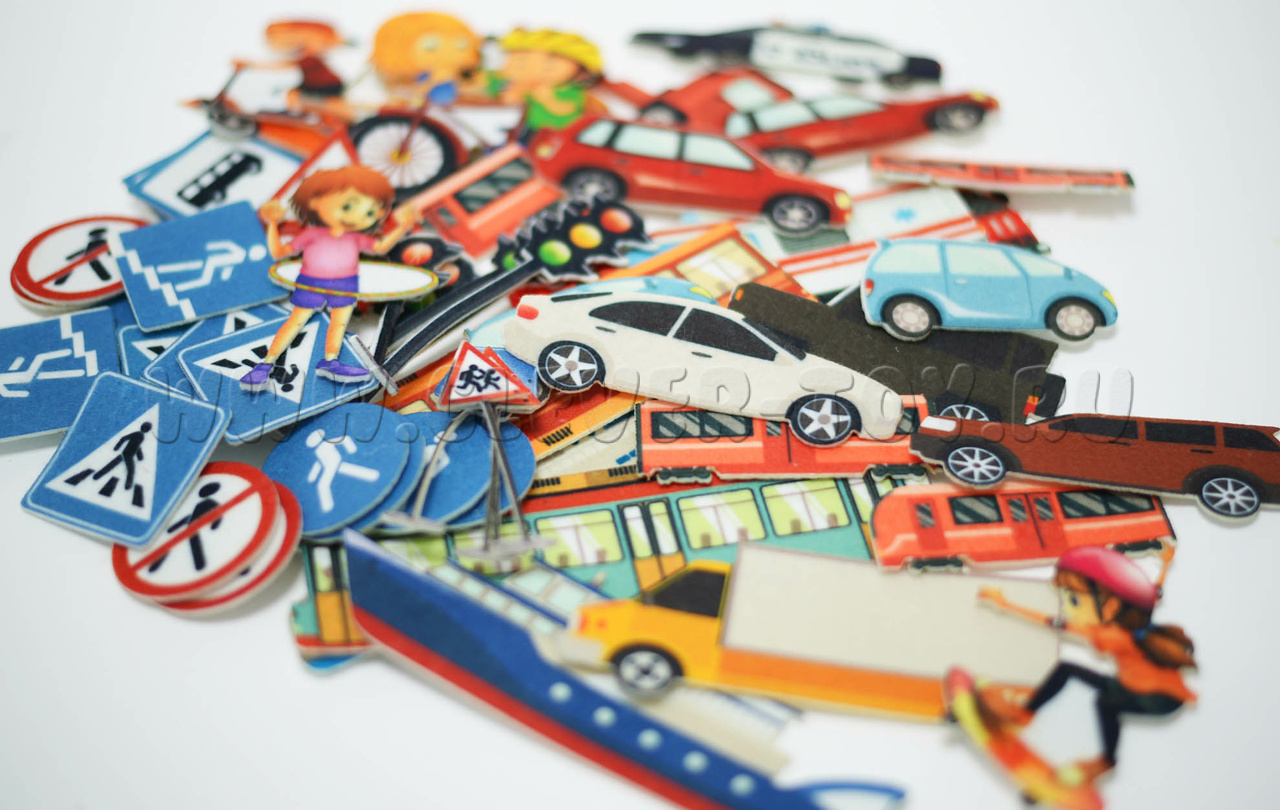 - 13 фигурок машинок и общественного транспорта: легковые и грузовые автомобили, поезд, троллейбус, полицейская машина, пожарная машина, скорая помощь, автобус; пароход и катер; более 20-ти дорожных знаков; 6 светофоров, 8 фигурок детей;