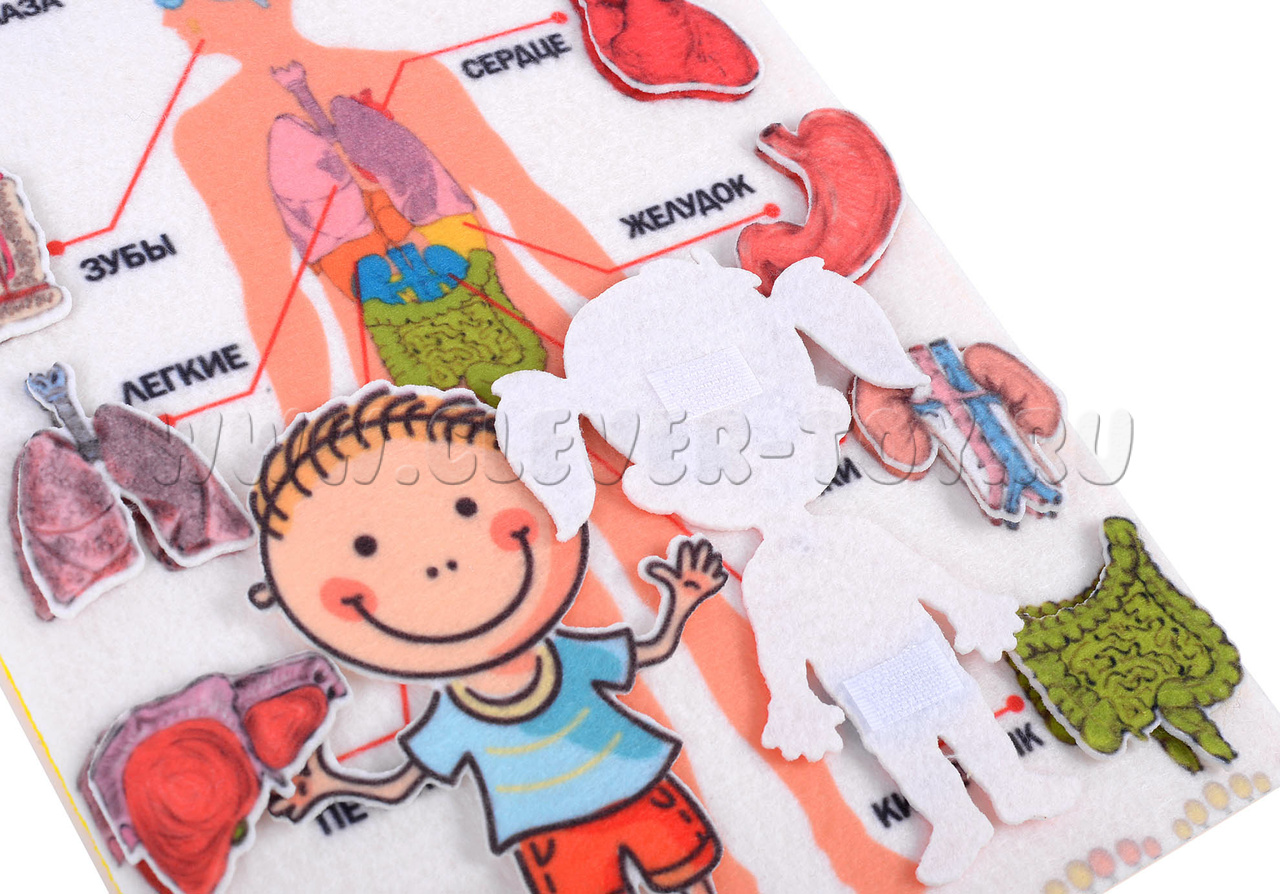 • игровое поле-плакат, где изображен человек и части его тела с подписями, на этом поле располагаются элементы – органы – на многоразовых липучках.