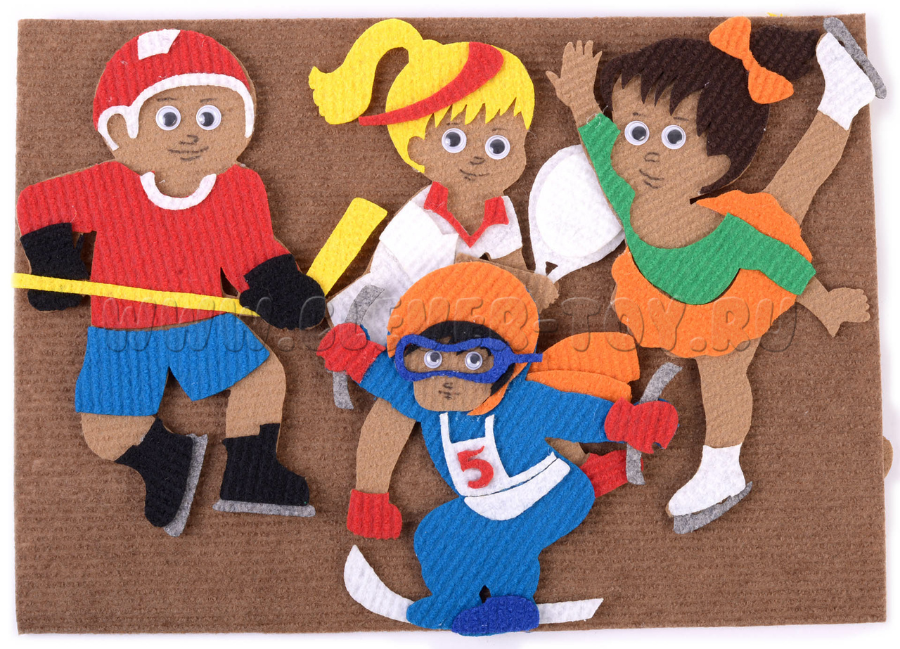Многоразовая аппликация для плоскостного конструирования посвящена самым популярным мировым видам спорта: хоккею, фигурному катанию, футболу, тяжёлой атлетике, хоккею, лыжному спорту, теннису.