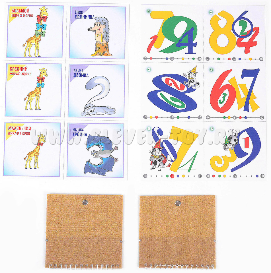 - 48 картонных карточек (105х100 мм): 24 игровых с цифрами (от 1 до 9), 24 призовых, обозначающих цвет, размер, положение (предлог),