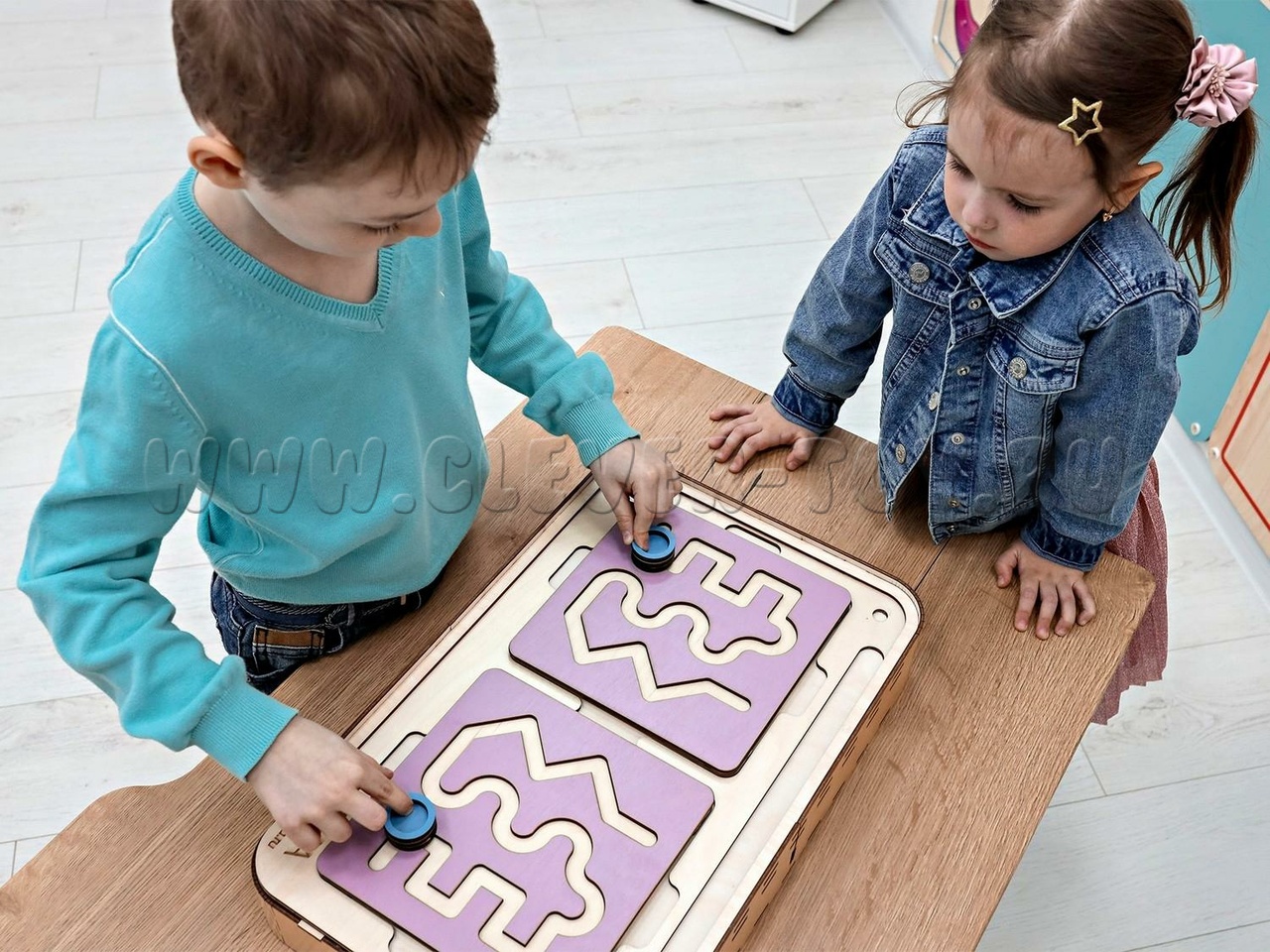 Два лабиринта с изображениями, расположенными симметрично, вставляются в пазы, и ребёнок проходит их с помощью специальных пальчиковых фишек.