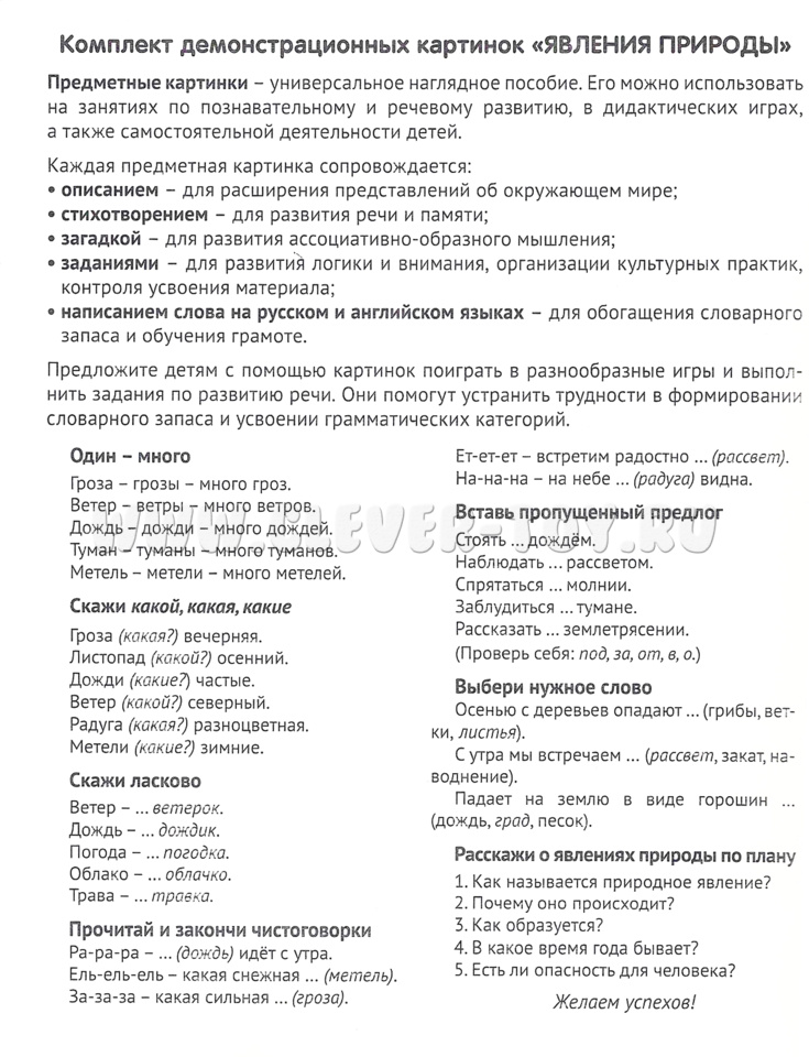 На лицевой стороне каждой карточки изображено явление природы, а на обратной - подробное описание. Дети узнают много интересного и поучительного о том, как возникают и проявляются различные природные явления.