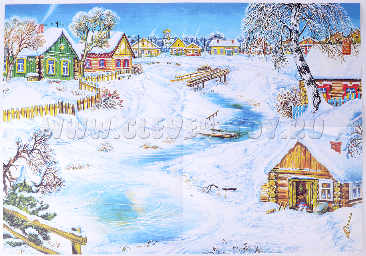 Коллективная аппликация "Времена года. Зима в деревне"