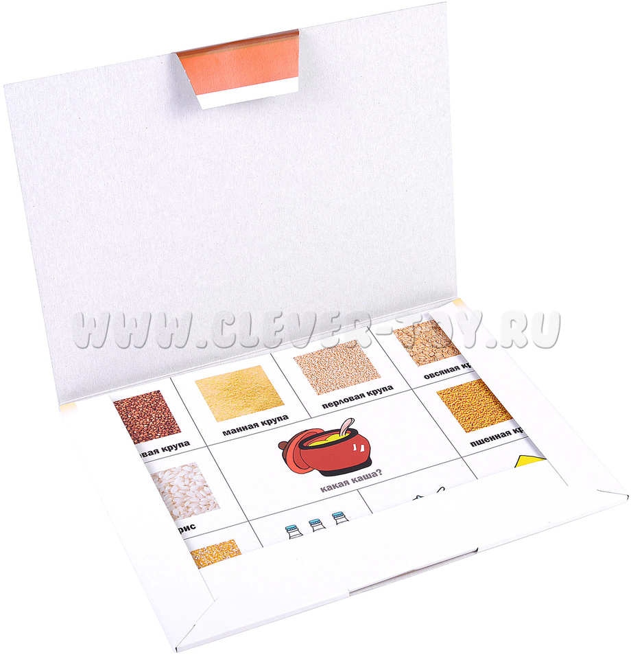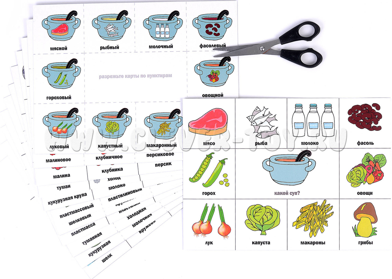 Игра включает в себя 7 лексических тем: "фрукты" и "овощи", "ягоды", "продукты", "дом" и "одежда", "времена года. поггода". В составе набора 6 игровых полей и 60 разрезных карточек с предметами, относящихся к одной лексической теме.