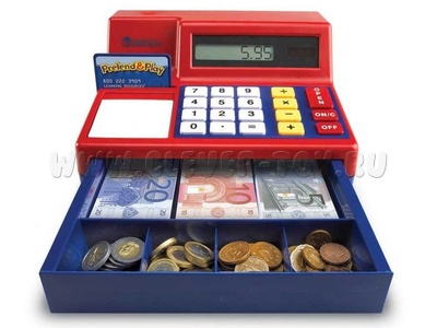 Игрушечный кассовый аппарат с рабочим денежным ящиком и калькуляторм на солнечной батарее.